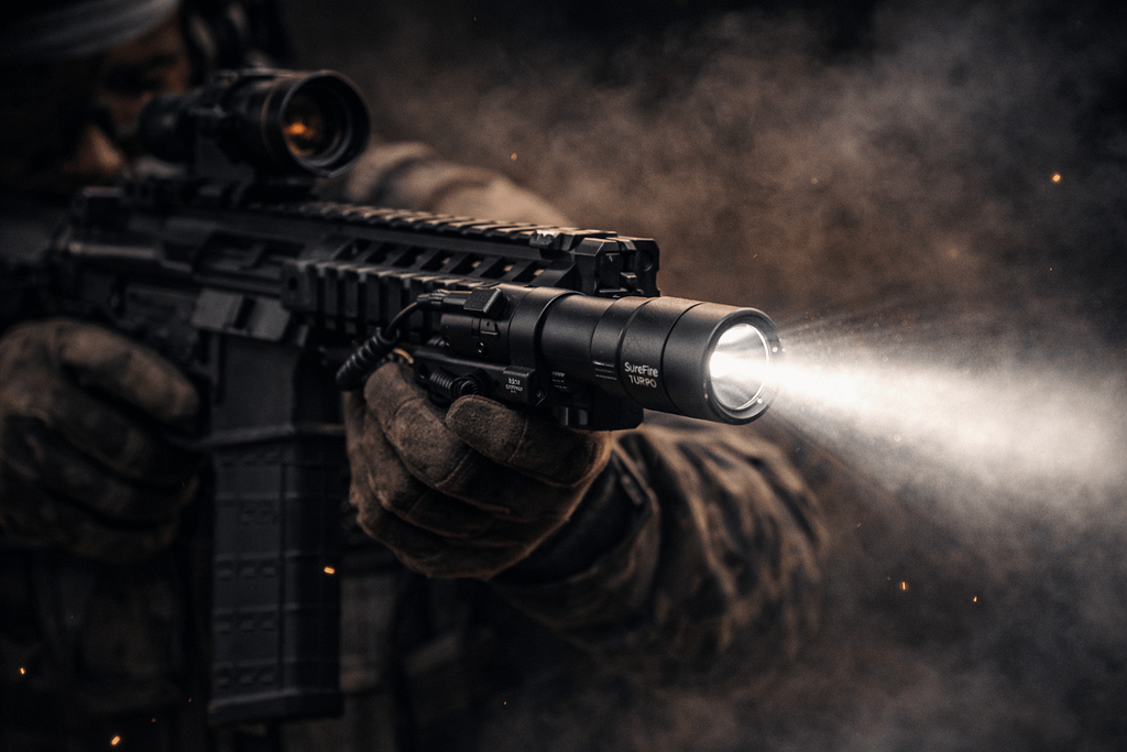 If your rifle lives outdoors — on rural property, perimeter security, or night training — candela becomes king. High-candela Turbo lights like the SureFire M340DFT-PRO or M640DFT-PRO let you identify what’s downrange without washing out under streetlights, vehicle headlights, or ambient glow.